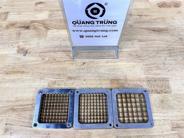 Với dụng cụ cắt củ quả con trì bạn có thể cắt với độ dày khác nhau tùy theo mục đích sử dụng với 3 loại khuôn cắt: Khuôn cho nguyên liệu đầu ra có kích thước 6 x 6 (mm), 9 x 9 (mm) và khuôn 13 x 13 (mm).