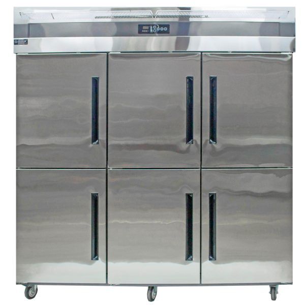 | Kết cấu và ưu điểm | - Tủ gồm 2 ngăn riêng biệt, 3 cánh trên là ngăn đông, 3 cánh dưới là ngăn mát - Thiết kế 6 cửa tiện lợi - Công nghệ tiết kiệm điện - Dàn lạnh bằng đồng bền bỉ, siêu bền - Sử dụng gas R404 thân thiện với môi trường - Chất liệu vỏ tủ: Inox chất lượng cao - 4 bánh xe di chuyển tiện lợi |